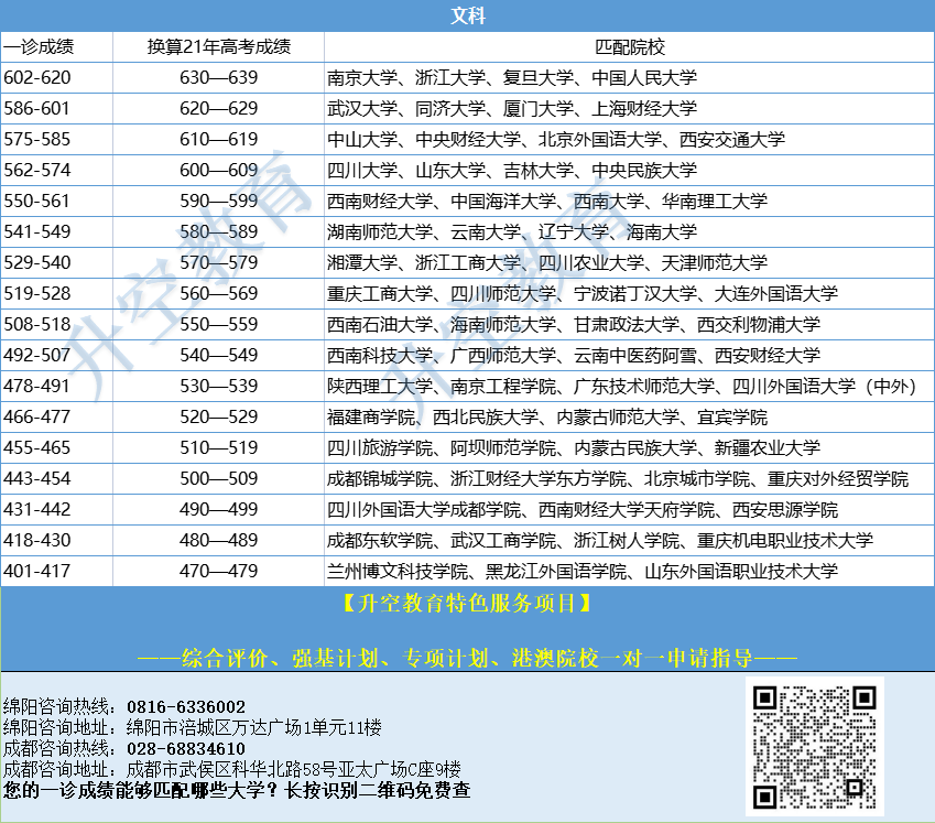 以上表中的分数均为换算出的分数,各位家长、同学需将2022届绵阳一诊成绩换成为21年高考成绩,如你的绵阳一诊成绩为586分,那么换算成高考成绩应该是多少分?然后再来看对应分段的院校。