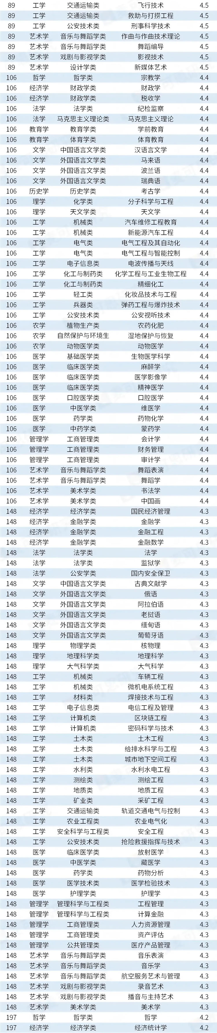 据统计,有326个专业的满意度较高,得分在4.1分及以上,占比(48.6%)接近一半。值得注意的是,得分在4.1分及以上的专业中,工学门类专业数量最多,共计114个,远超其后的文学(30个)、医学(27个)等学科领域。