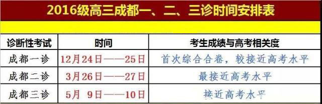 高2019届2016级成都高三成都一、二、三诊时间已基本确定,刚好是第一轮(基础)复习、第二轮(巩固)复习,第三轮(查漏补缺)复习的结束,成都三次诊断性考试成为了成都考生乃至四川考生每轮复习最重要的检验性诊断考试。