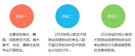 但是,针对极少数艺术团测试成绩特别突出的考生,2020年优惠幅度有所下降,在2019年及以前,对于极少数艺术团测试成绩特别突出的考生,文化课分数可降至一本线。但2020年起对极少数艺术团测试成绩特别突出的考生的降低文化课成绩录取的优惠将取消。