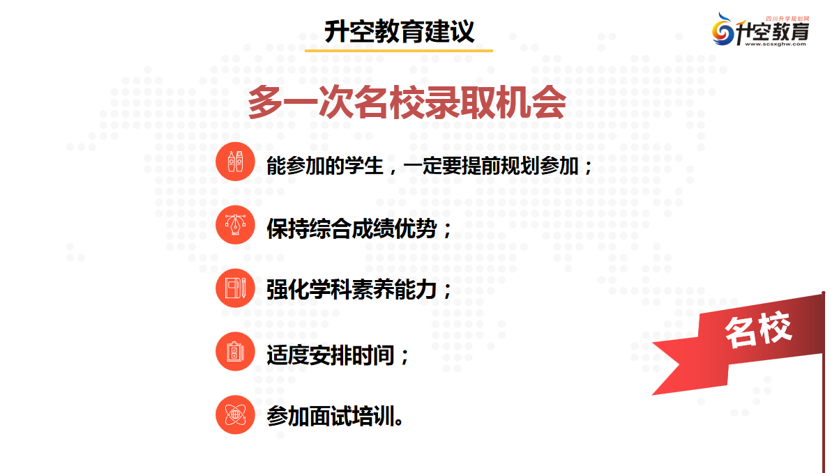 四川冠博升空教育咨询有限公司成立于2008年(以下简称升空教育),是西南片区成立最早的升学规划指导机构之一,也是率先引进ISO9001“高中生升学咨询服务”国际质量认证体系的机构。我们服务的主要内容有:高考志愿填报、强基计划、综合评价、少数民族预科、国家专项、高校专项、地方专项、高水平艺术团、高水平运动队、高中生学情管理、大学生学业与职业规划等项目,全方位多渠道为高中学子量身定制升学规划。公司以“诚信负责、质量为本、勤学精进、开拓创新”的服务理念,多年来帮助万余名学子实现学业梦想。