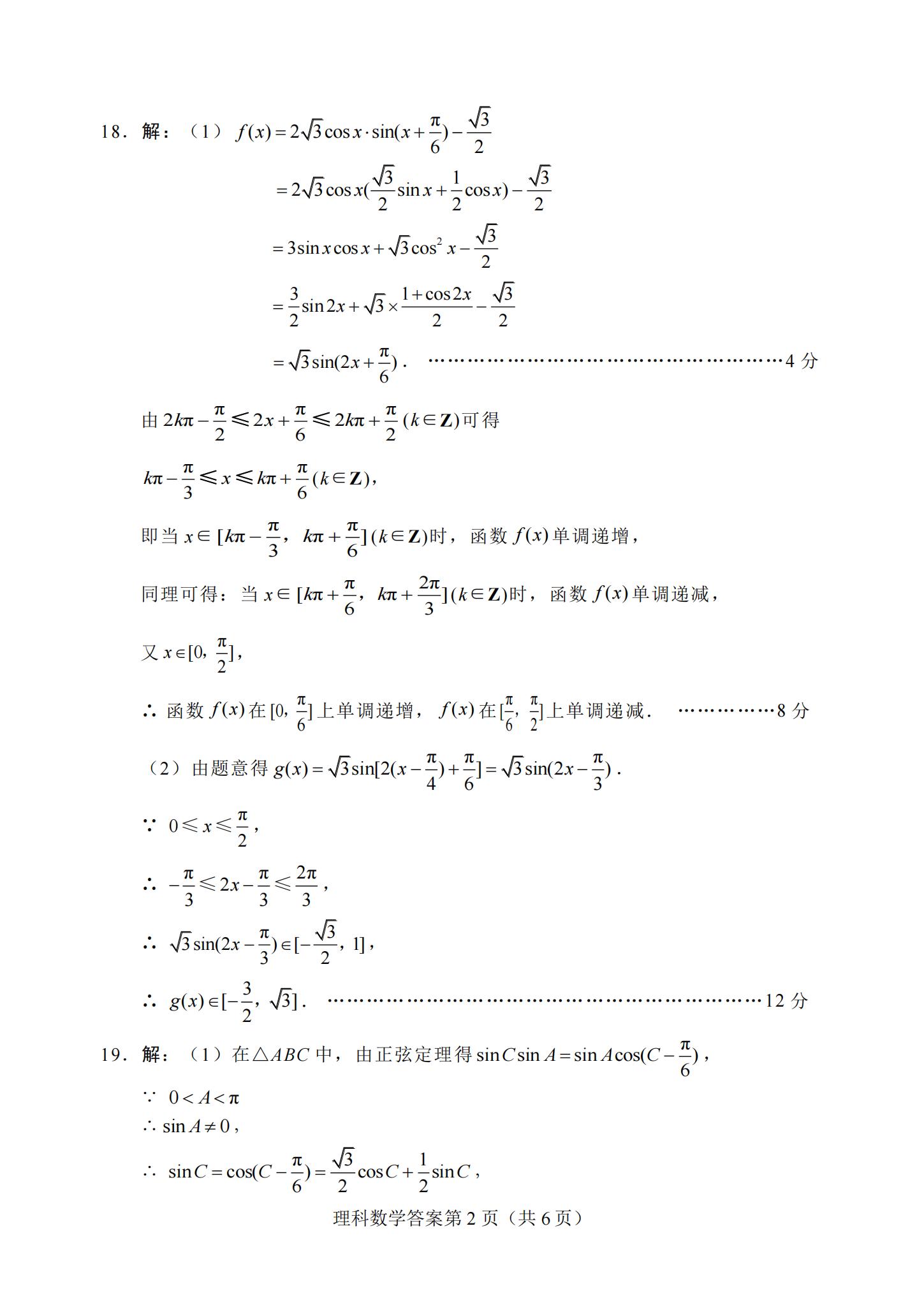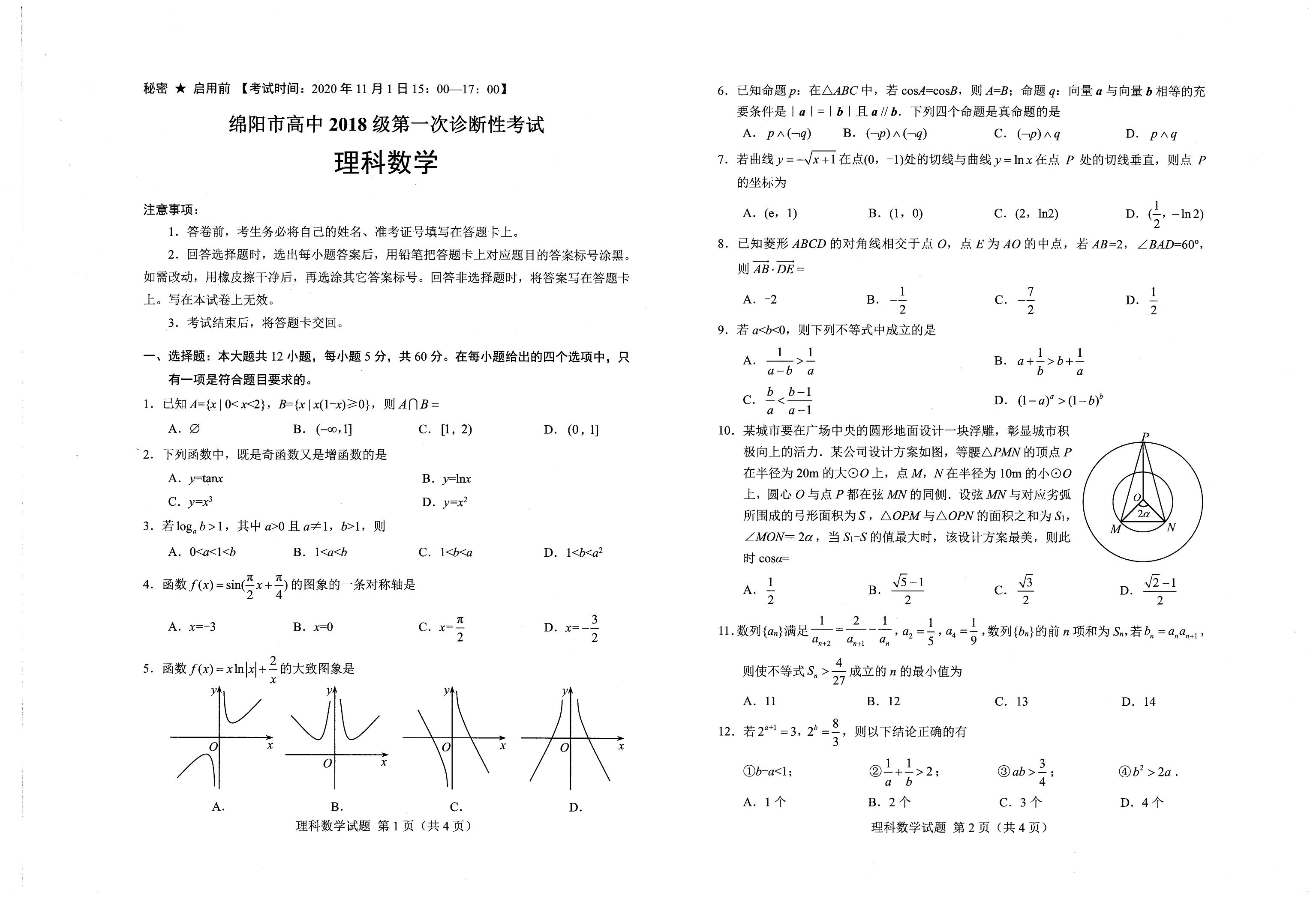 2021届绵阳一诊理科数学试题及答案: