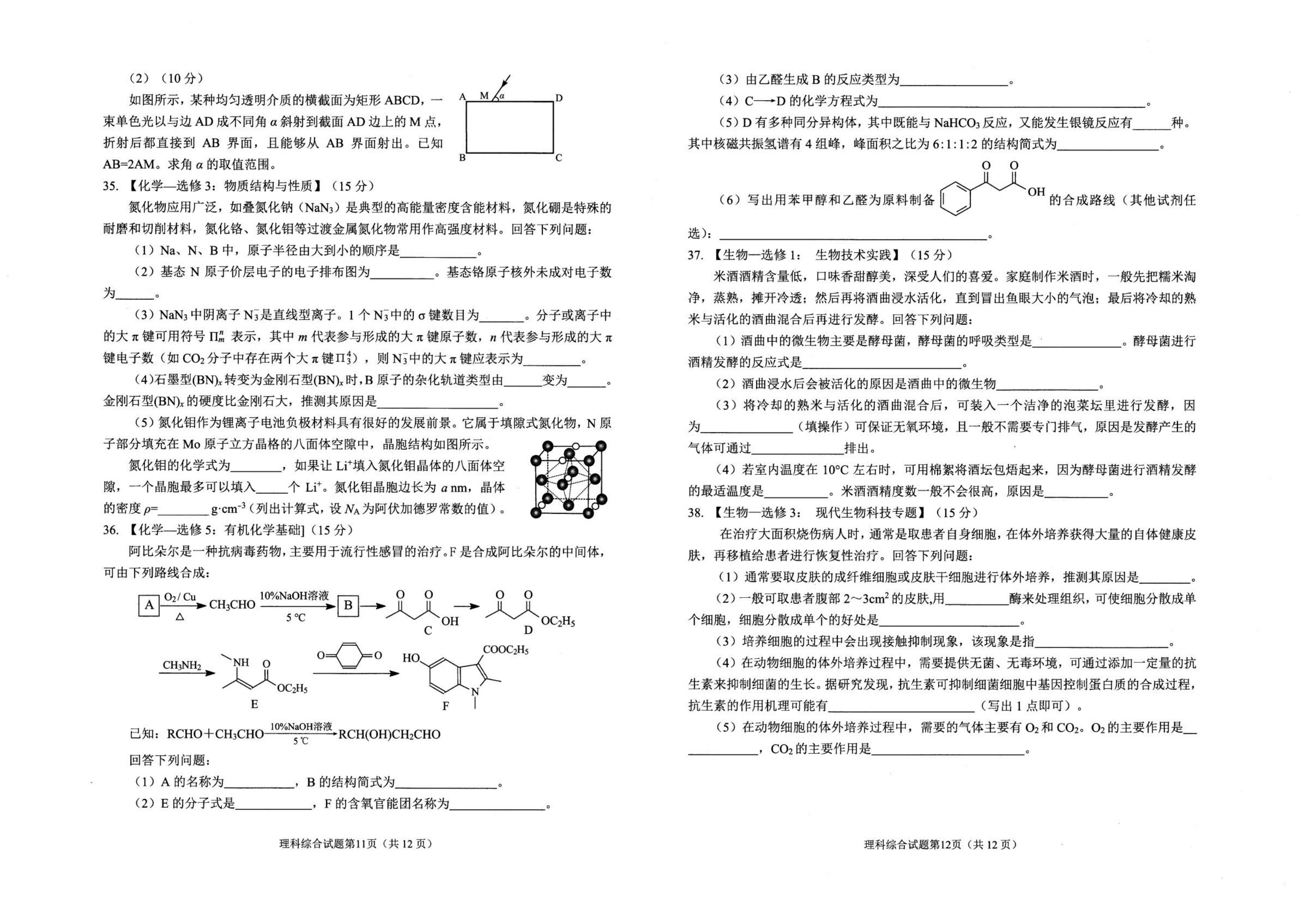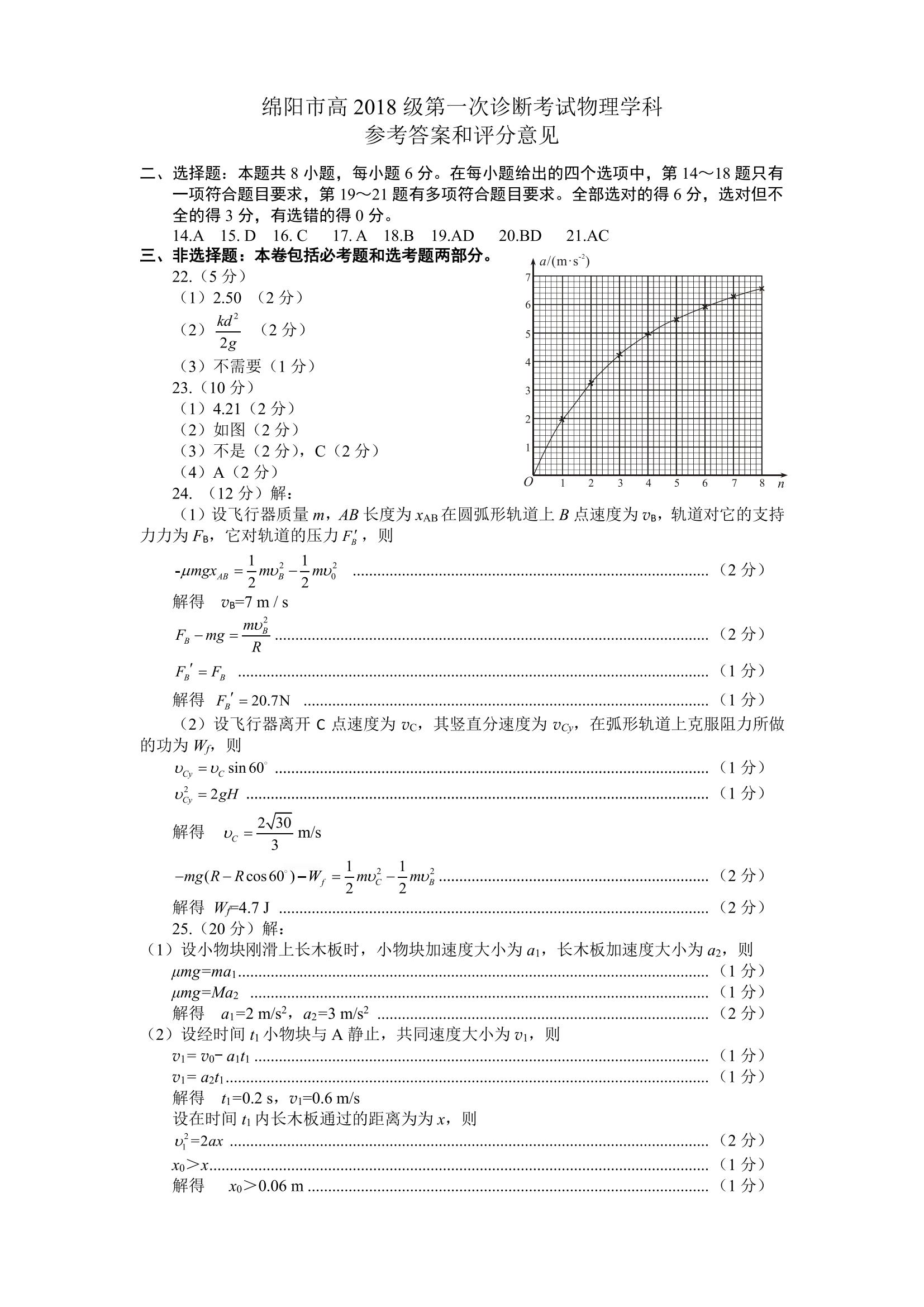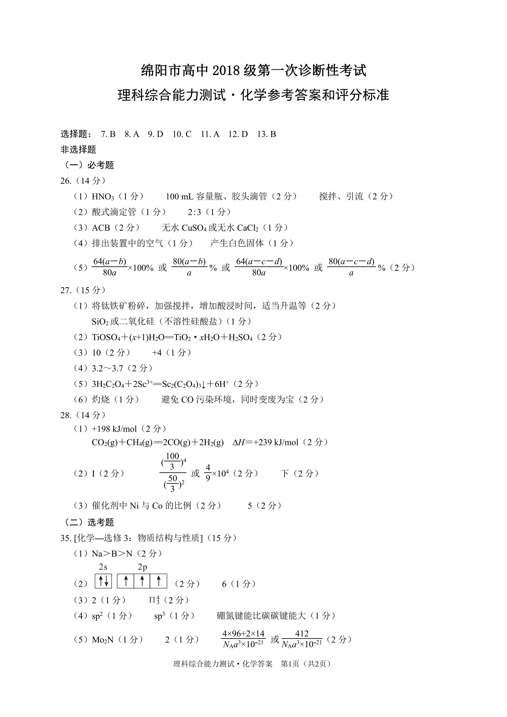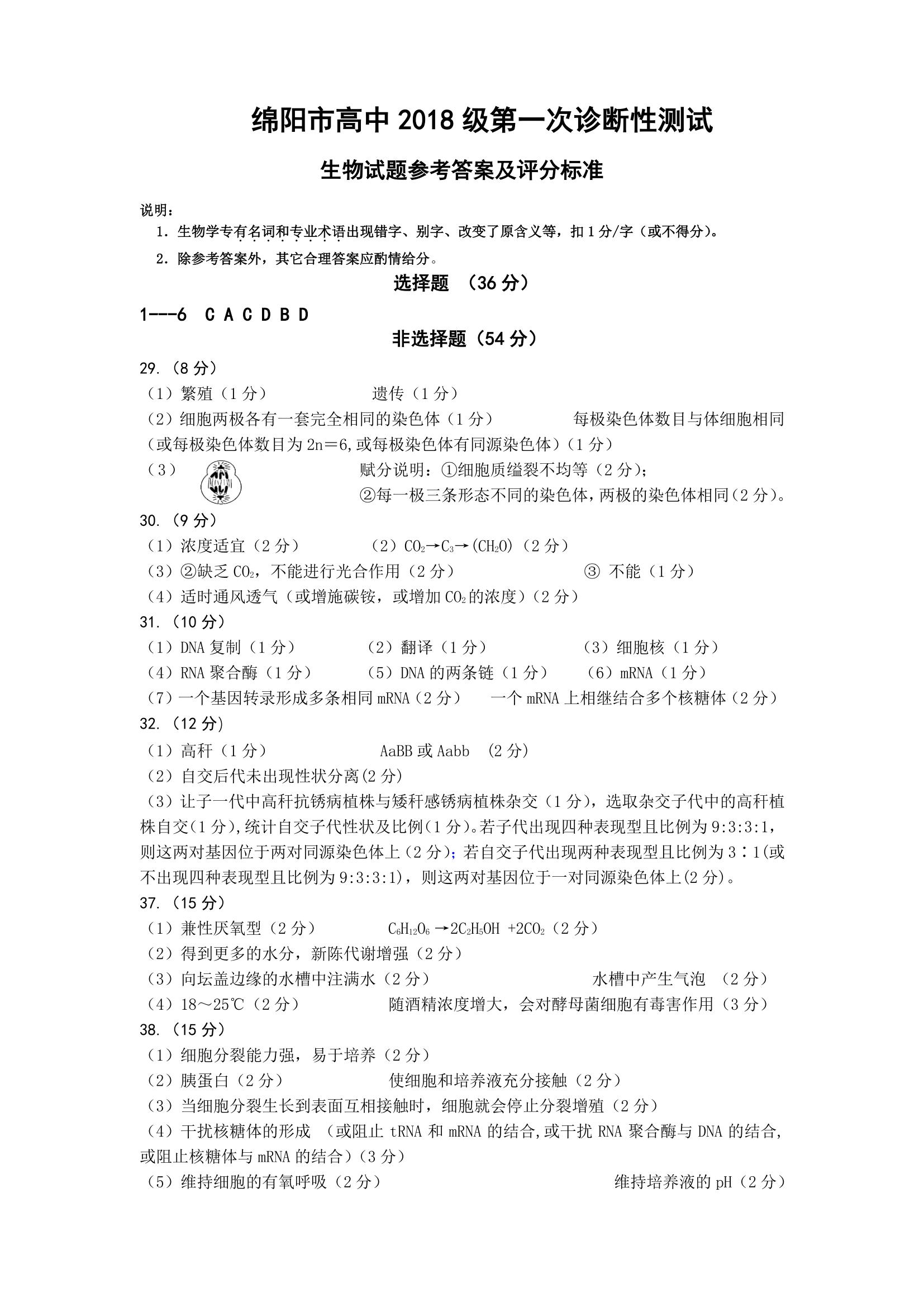 2021届绵阳一诊理综试题及答案:
