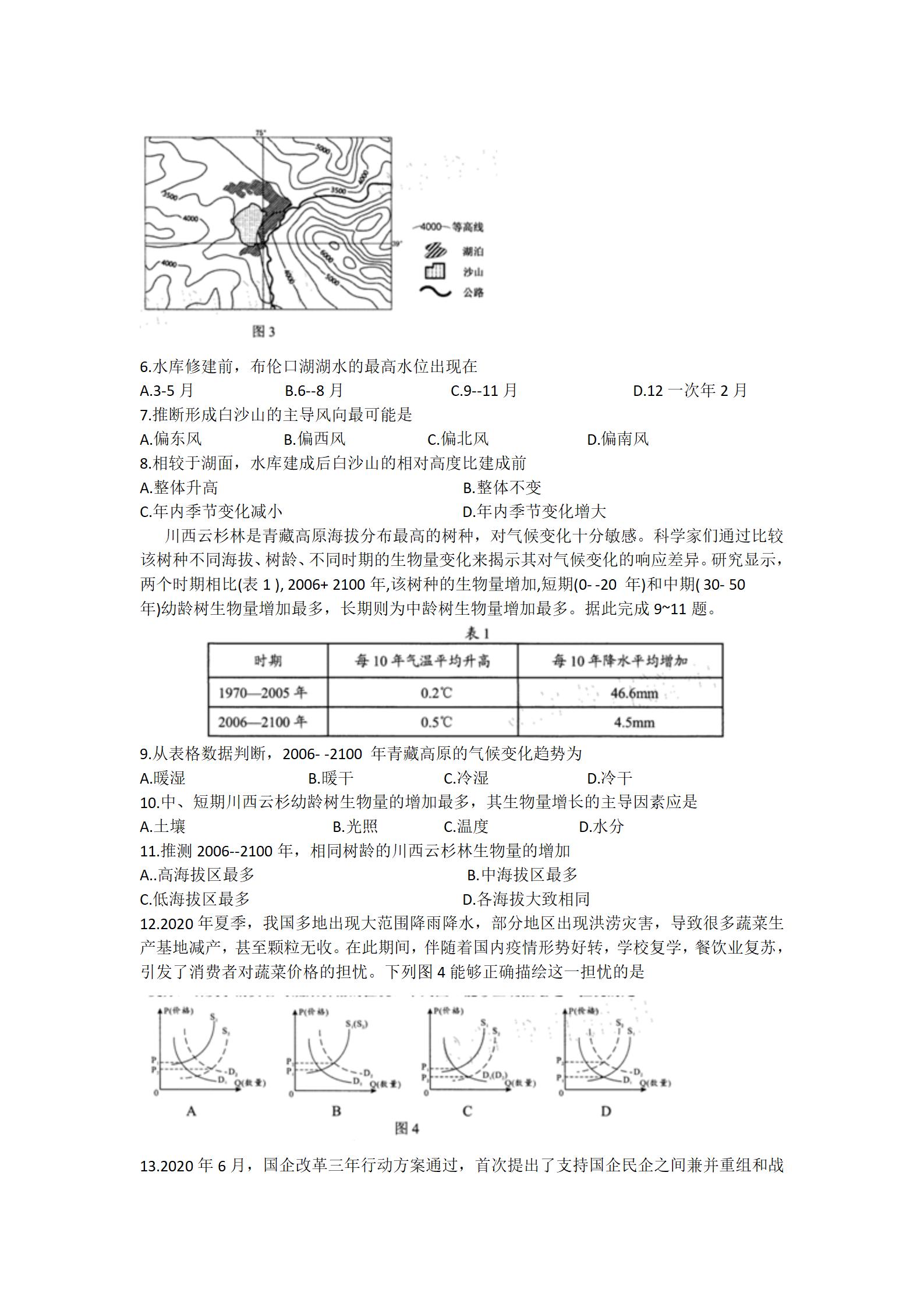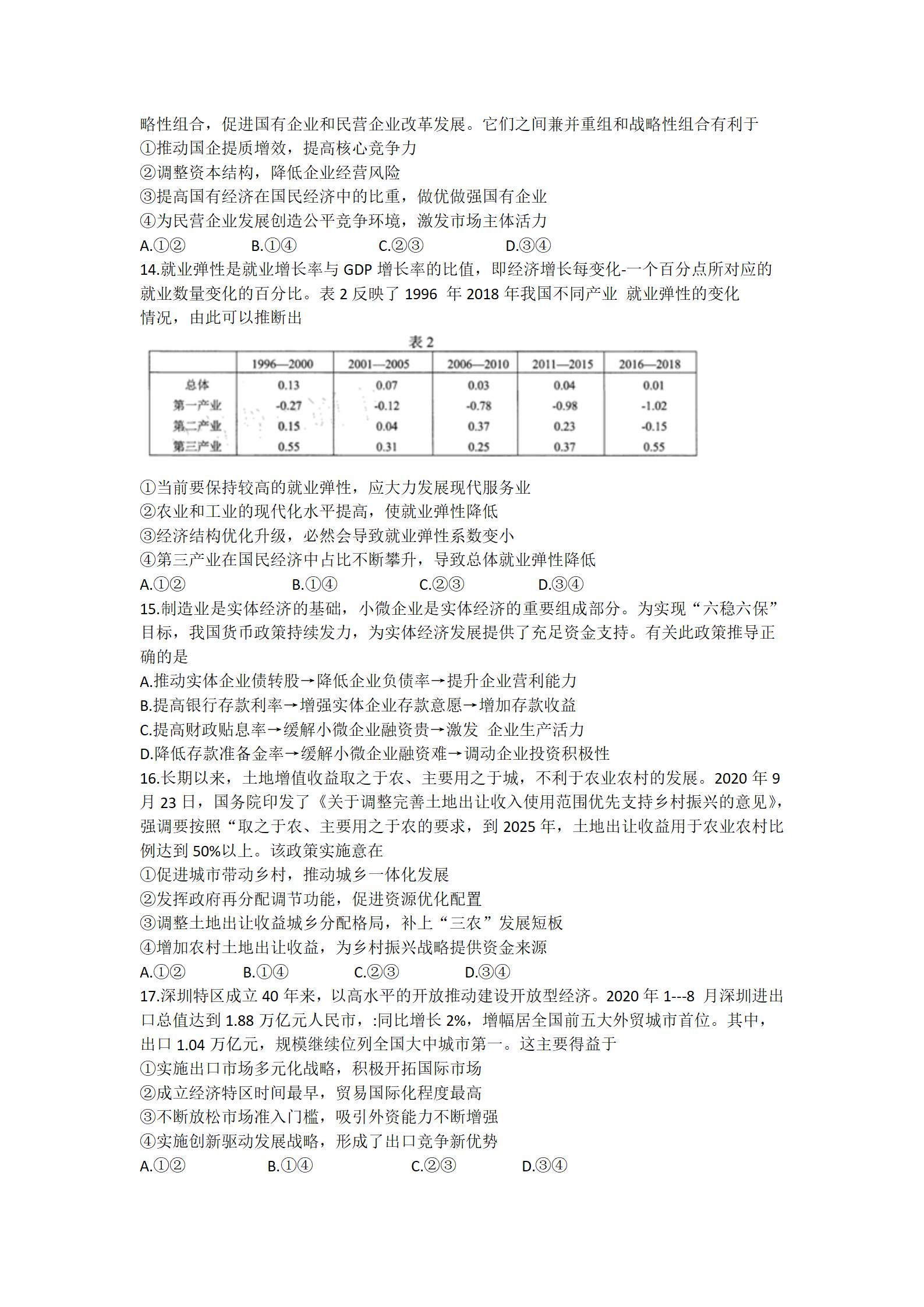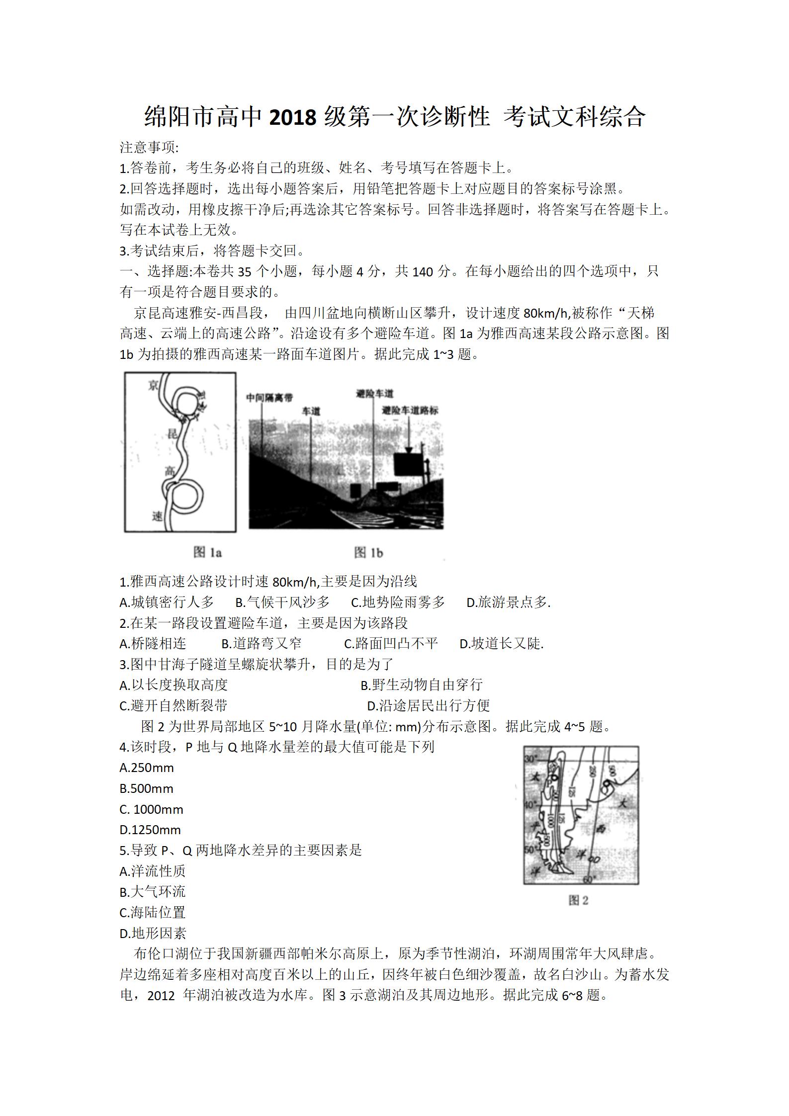 2021届绵阳一诊文综试题及答案: