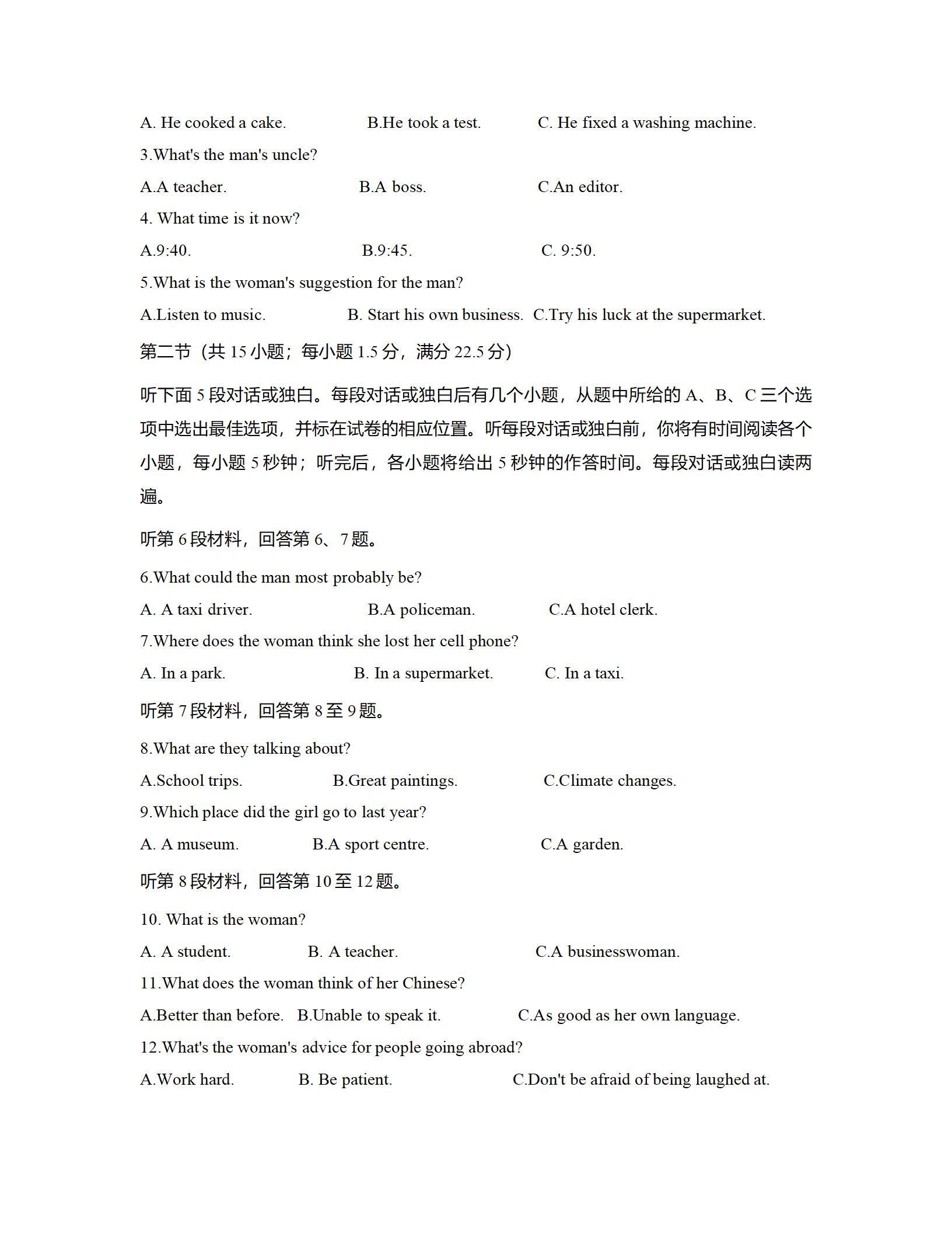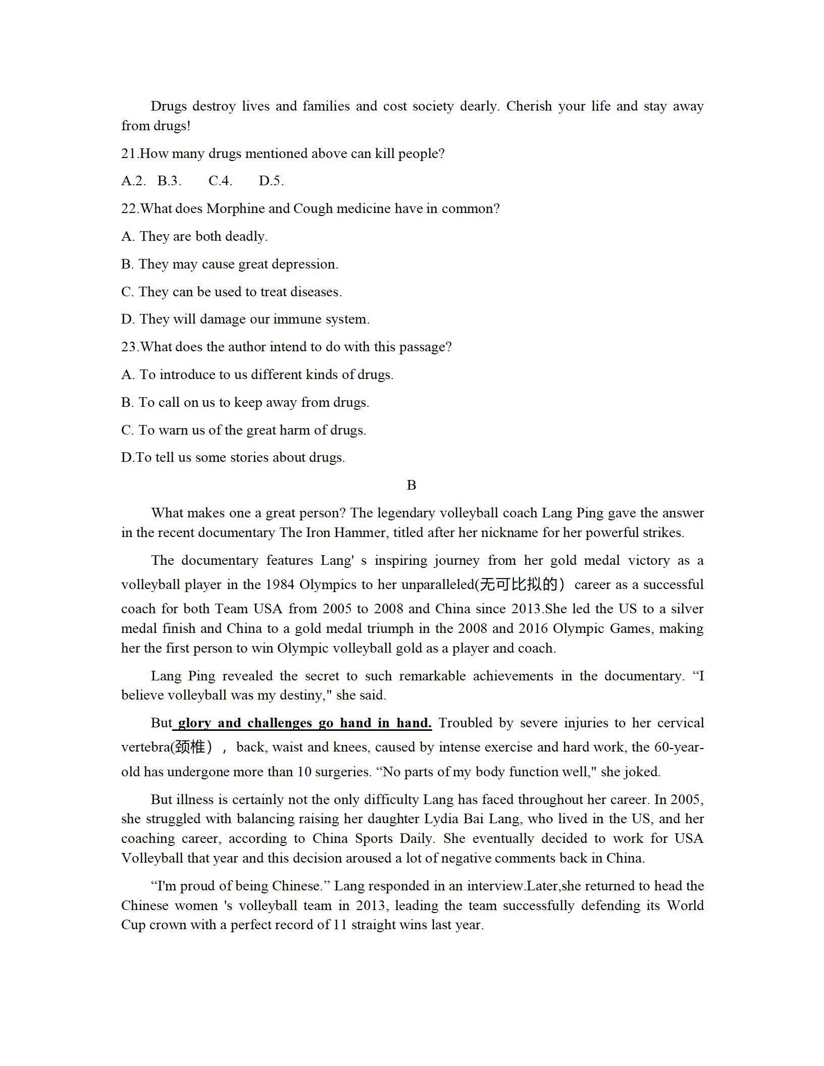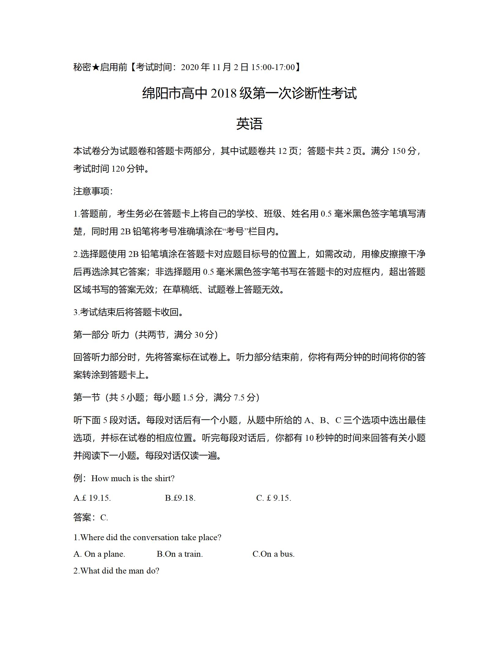 2021届绵阳一诊英语试题及答案:
