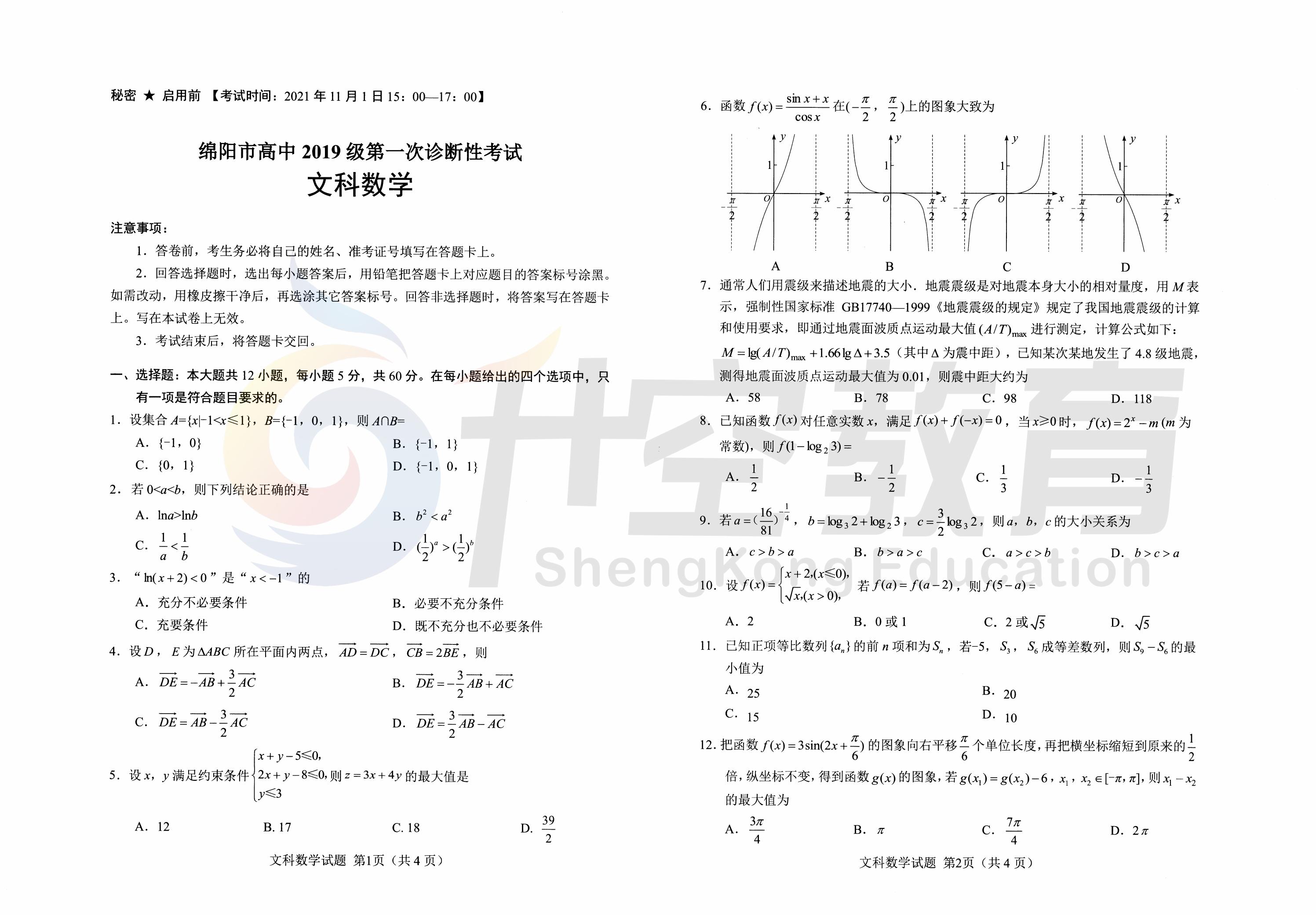 2022届绵阳一诊考试已于11月1日、2日举行,经过第一轮复习 ,绵阳的同学们,本次绵阳一诊考试考得如何?快来核答案了!以下提供2022届绵阳一诊文科数学试题及答案图片展示。