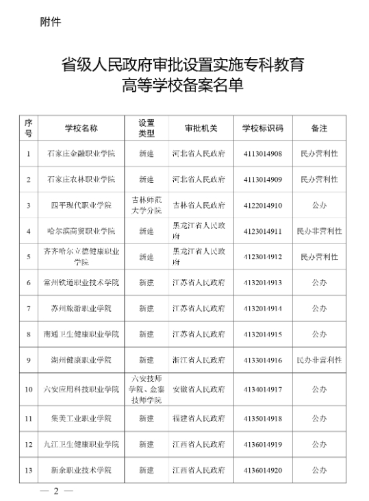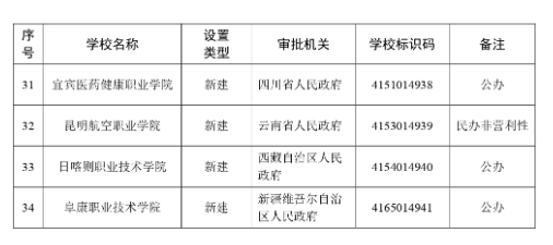 据统计,名单公布了34所新设专科院校,其中32所院校为新建。分办学性质来看,14所公办院校,20所民办院校。具体名单如下: