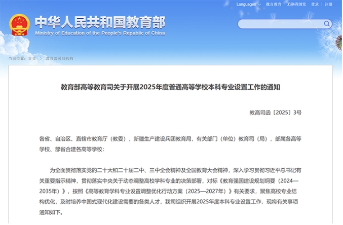 教育部高等教育司关于开展2025年度普通高等学校本科专业设置工作的通知
