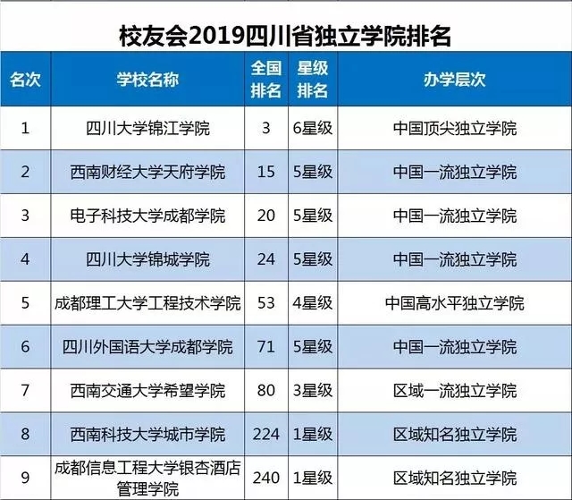 在最新校友会2019中国独立学院排名中,四川大学锦江学院、西南财经大学天府学院、电子科技大学成都学院、四川大学锦城学院、成都理工大学工程技术学院名列校友会2019四川省独立学院排名前5强。