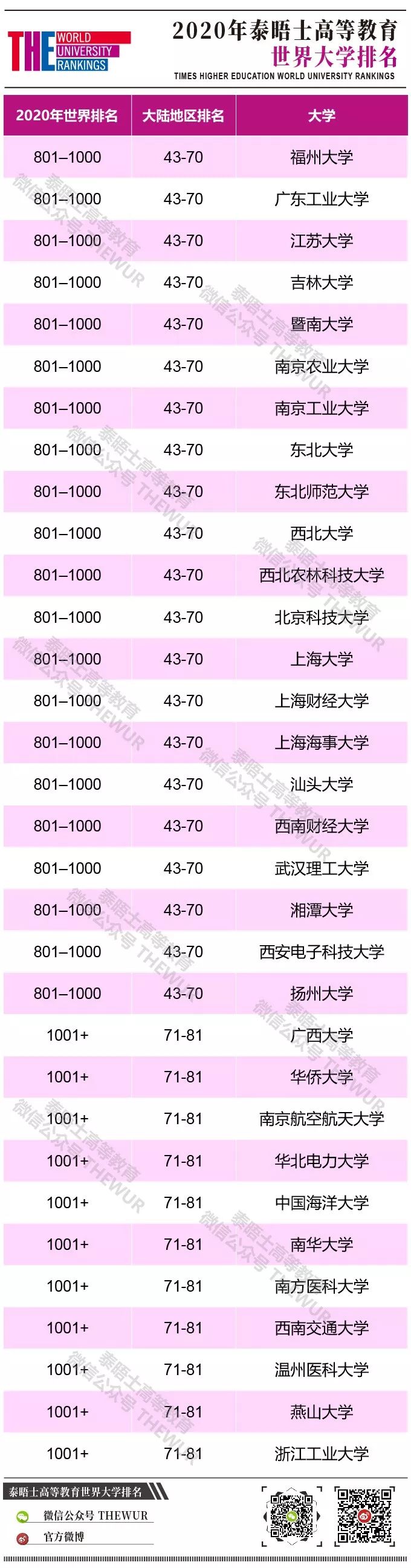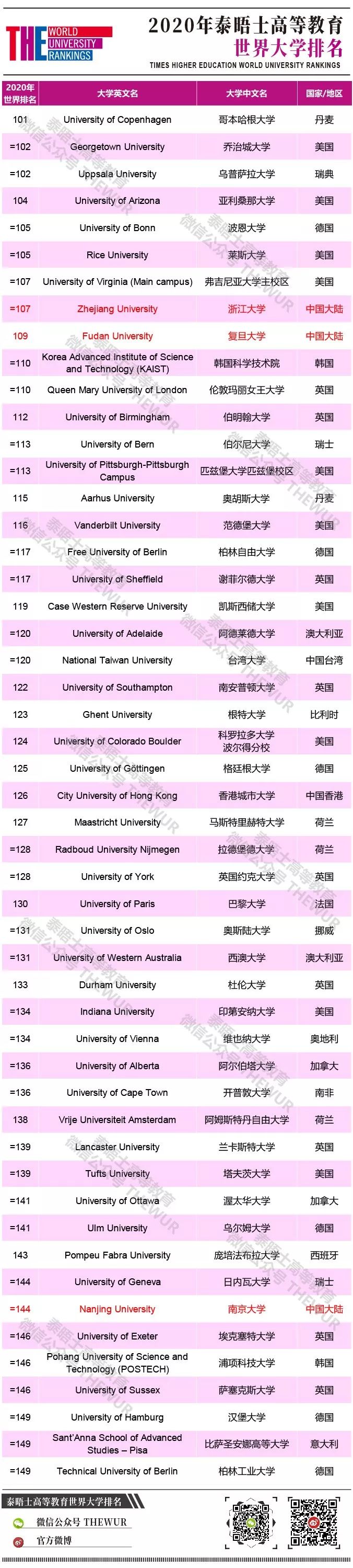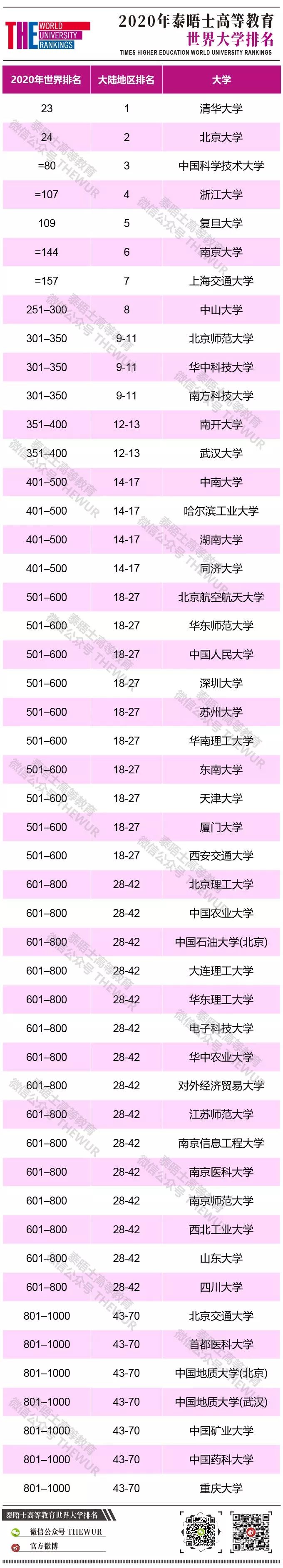 中国大陆今年有10所大学新加入排名。其中表现最好的是北京师范大学, 排名位于301—350区间。北京师范大学是中国政府双一流大学计划的受益者之一,中国计划在2050年年底之前将一批精英高校和学院发展成世界一流的大学和学科。