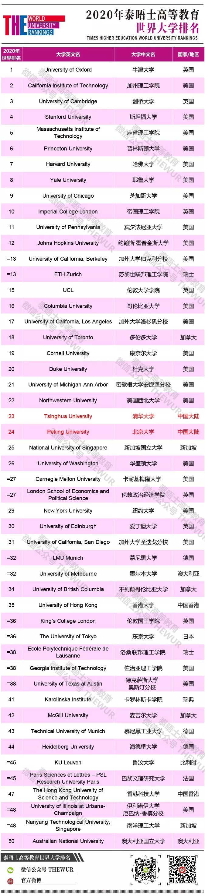 牛津大学连续四年位居榜首;加州理工学院排名第二