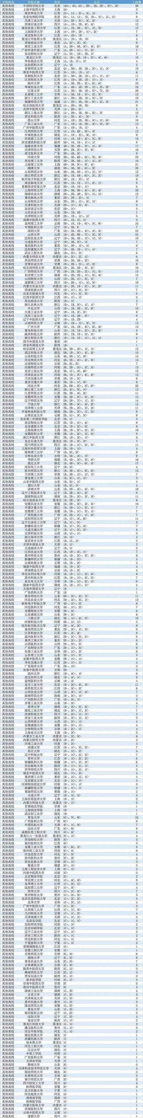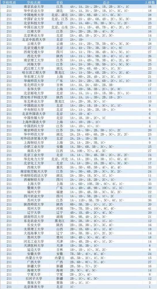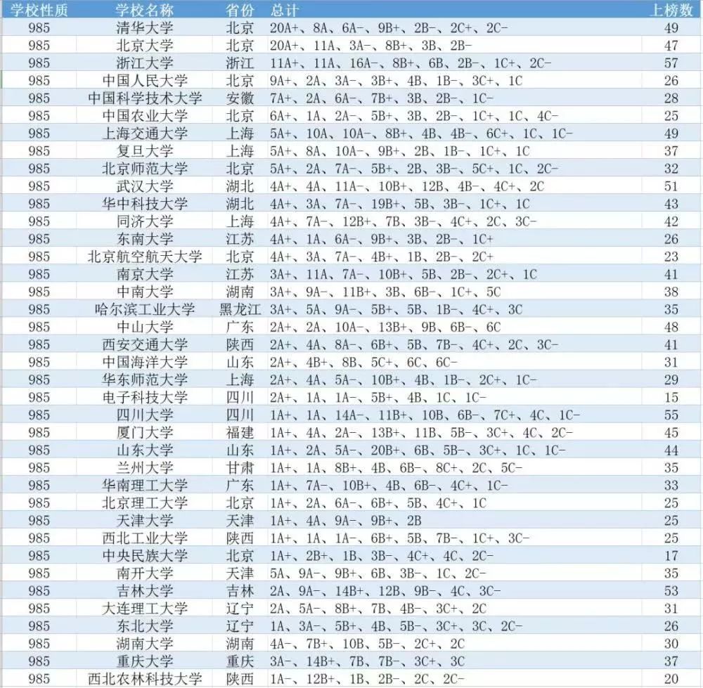 下面从学科评估结果整体统计的角度对部分实力较强的高校进行简要分析。当然,可能会对某些高校不公平,比如东南大学、北京航空航天大学、北京理工大学、天津大学、电子科技大学等上述高校由于没有参加本轮理学学科,整体统计结果肯定是低估的。