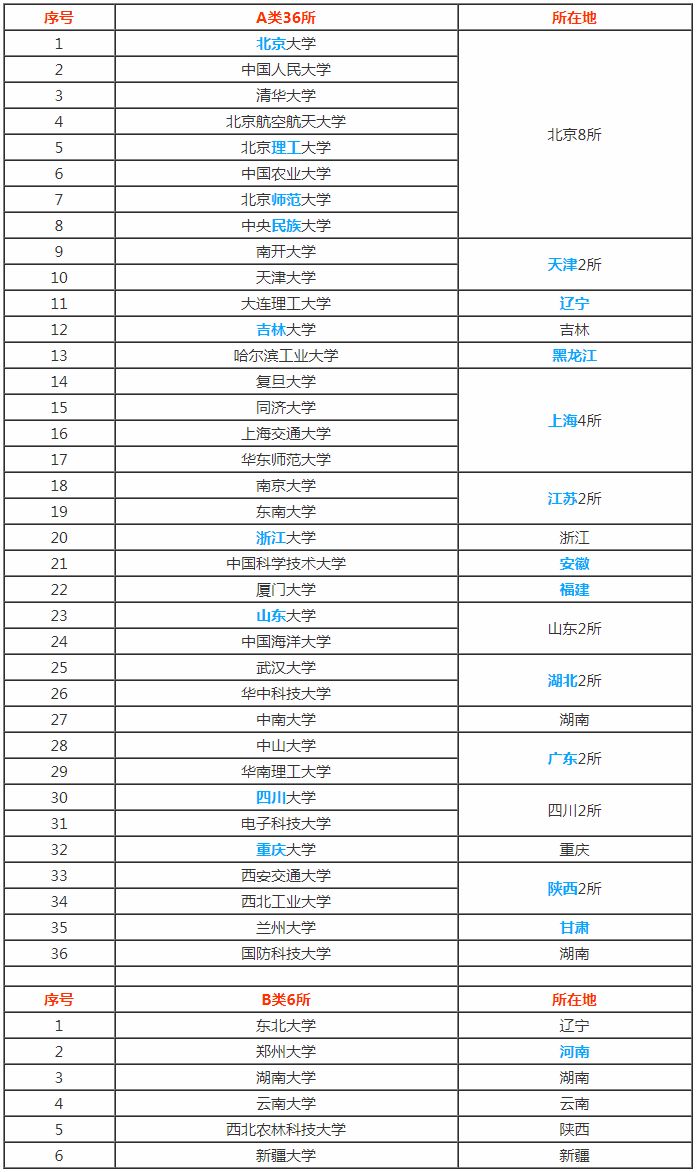 A类:北京8所,天津2所,辽宁1所,吉林1所,黑龙江1所,上海4所,江苏2所,浙江1所,安徽1所,福建1所,山东2所,湖北2所,湖南2所,广东2所,四川2所,重庆1所,陕西2所,甘肃1所。