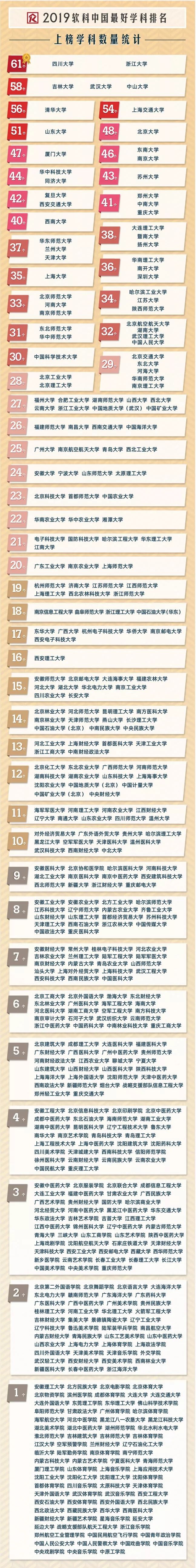 按照上榜次数统计,四川大学和浙江大学均有61个学科上榜,领先国内其它高校,吉林大学、武汉大学、中山大学、清华大学、上海交通大学、山东大学的上榜学科数也都超过50个。