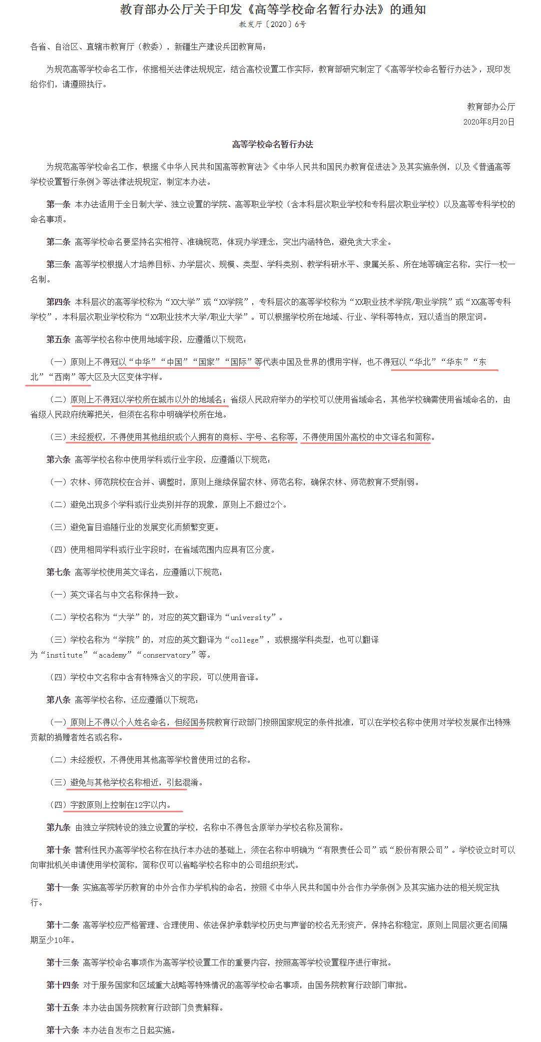 你能想象大学不能冠以“中国”、“国家”、“国际”、“华东”、“华南”、“人名”等字样后会是什么样子吗?
