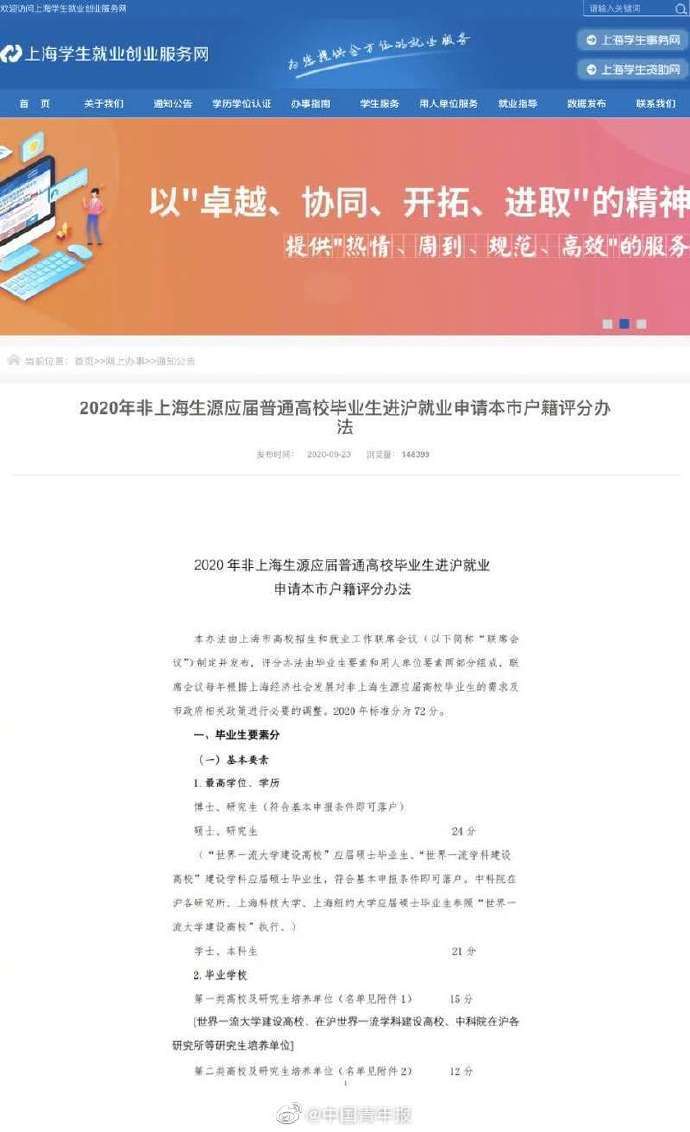 【交大、复旦、同济、华师4校学生毕业即可落户上海】今天,《2020年非上海生源应届普通高校毕业生进沪就业申请本市户籍评分办法》正式发布。《办法》明确提出,将之前“以北京大学、清华大学为试点,探索建立对本科阶段为国内高水平大学的应届毕业生,符合基本申报条件即可落户”的政策,范围扩大至在沪“世界一流大学建设高校”。在沪“世界一流大学建设高校”包括上海交通大学、复旦大学、同济大学、华东师范大学,即该4校应届本科毕业生符合基本申报条件即可直接落户。《办法》还提到,“博士、研究生符合基本申报条件即可落户”,“世界一流大学建设高校应届硕士毕业生符合基本申报条件即可落户”。因此,交大、复旦、同济和华师大的本科、硕士、博士应届毕业生符合申报条件即可直接落户。