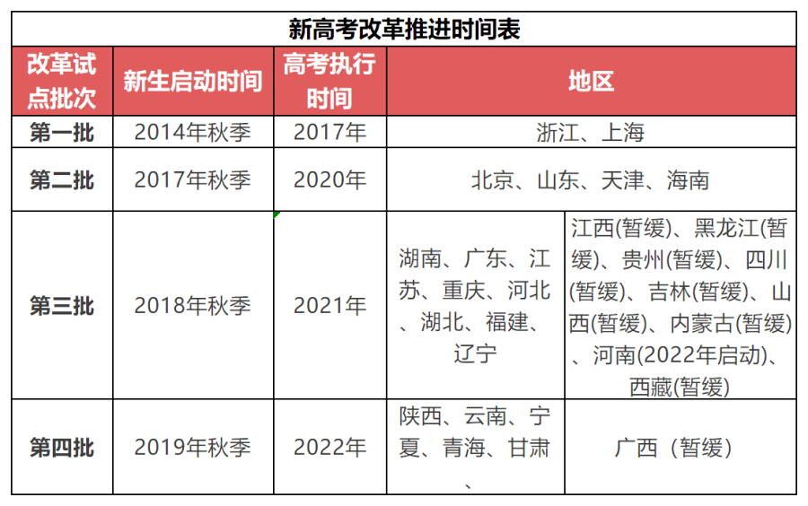 目前新高考改革主要分四批进行,启动时间指从这一年的高一新生开始进行新高考选科,执行时间指的是这一年的新高三参加的高考将是新高考。