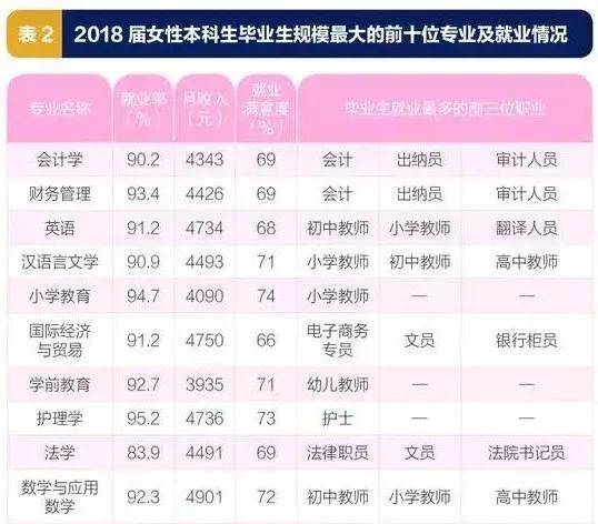 分析2018届女性本科生就业情况发现,“会计学”“财务管理”“英语”是女性本科毕业生规模最大的前三专业。