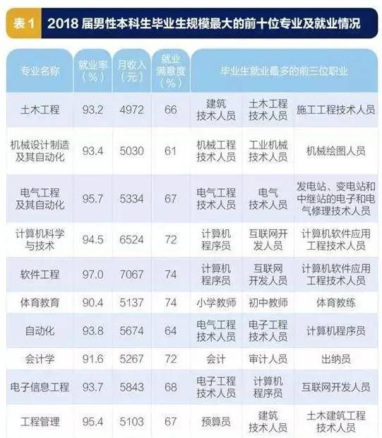 数据显示,2018届男性本科毕业生规模最大的前三个专业分别是“土木工程”“机械设计制造及其自动化”“电气工程及其自动化”。