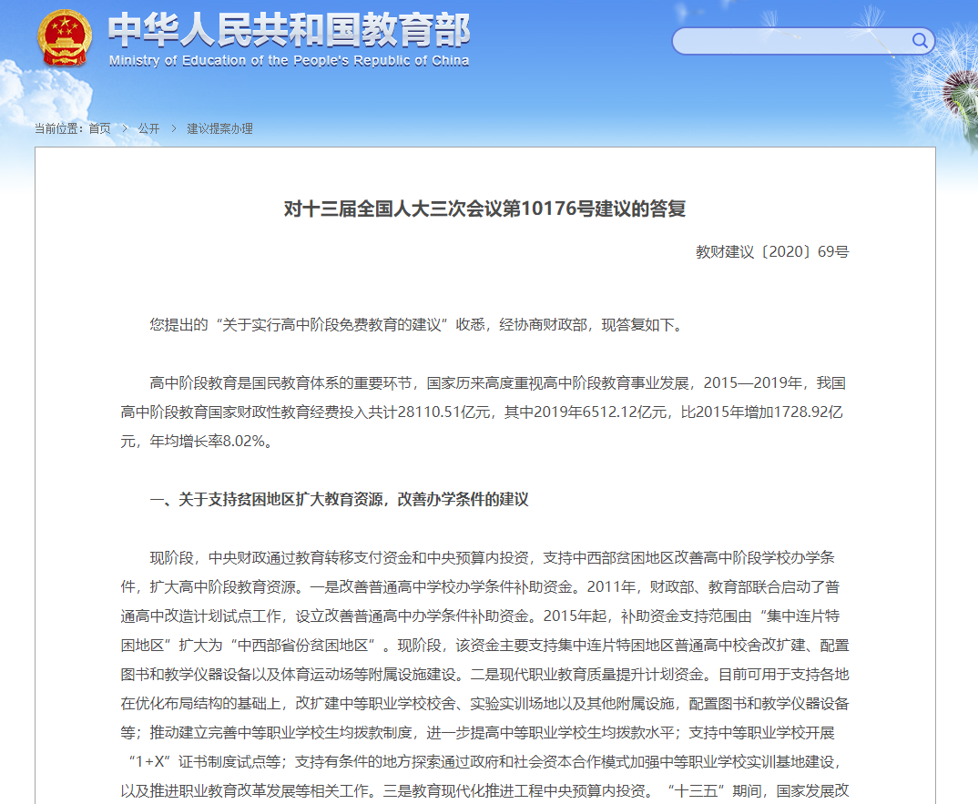 教育部提到,2018年8月,国务院办公厅印发《关于进一步调整优化结构提高教育经费使用效益的意见》,明确始终坚持把义务教育作为教育投入的重中之重,要求各地严格执行义务教育法,坚持实行九年义务教育制度,严禁随意扩大免费教育政策实施范围。根据《国务院办公厅关于印发教育领域中央和地方财政事权和支出责任划分改革方案的通知》精神,高中阶段教育,实行政府投入为主、受教育者合理分担、其他多种渠道筹措经费的投入机制。