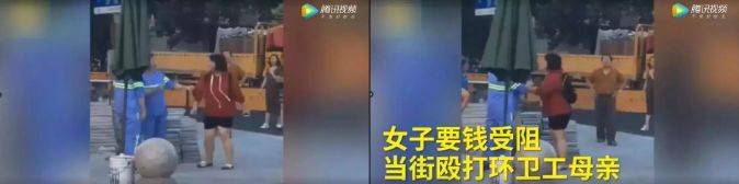 一名体型较胖的年轻女子,用手狠狠地拽着一个环卫工人拖行数米,旁边其他环卫工急忙上前拦架。