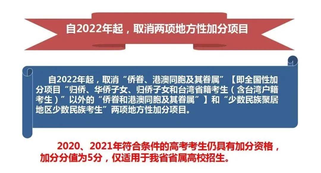 (一)归侨、华侨子女、归侨子女考生和台湾省籍考生(含台湾户籍考生),加分分值从2021年起从10分调整为5分,可面向所有高校投档时使用。
