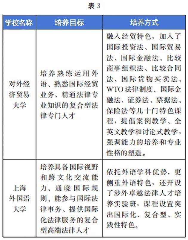 即使同一个专业往往有多所高校开设,但由于不同的高校办学实力、优势特色、师资构成、地理位置等因素的影响而出现差异。我们想深入了解专业,不应想当然地认为同一个专业在哪个学校学习都是一样的。例如法学专业,根据阳光高考平台的统计,全国有六百多所高校都开设了法学本科专业。通过比较可以发现,不同高校的法学专业,培养目标和培养方式是各具特色的,如表3所示。