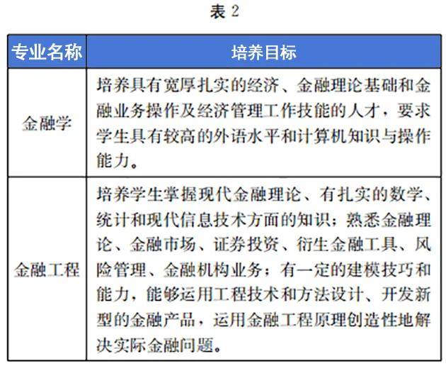 2.看培养如果两个名称相似的专业,同属于一个学科门类或专业类,意味着他们在学习内容上会有一定的相似度,此时通过所属门类、课程设置等方法来区分专业,难度较大,需要我们结合高校的培养方式或培养目标来进行判断。比如同属于经济学门类—金融学类的金融学和金融工程两个专业,在西南财经大学的培养目标中呈现出了细微的差别(见表2):