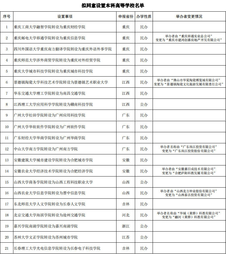 11月11日,教育部发布《关于拟同意设置本科高等学校的公示》,拟同意重庆工商大学融智学院等21所独立学院转设为独立设置的本科学校,公示时间为2020年11月11日至11月25日。