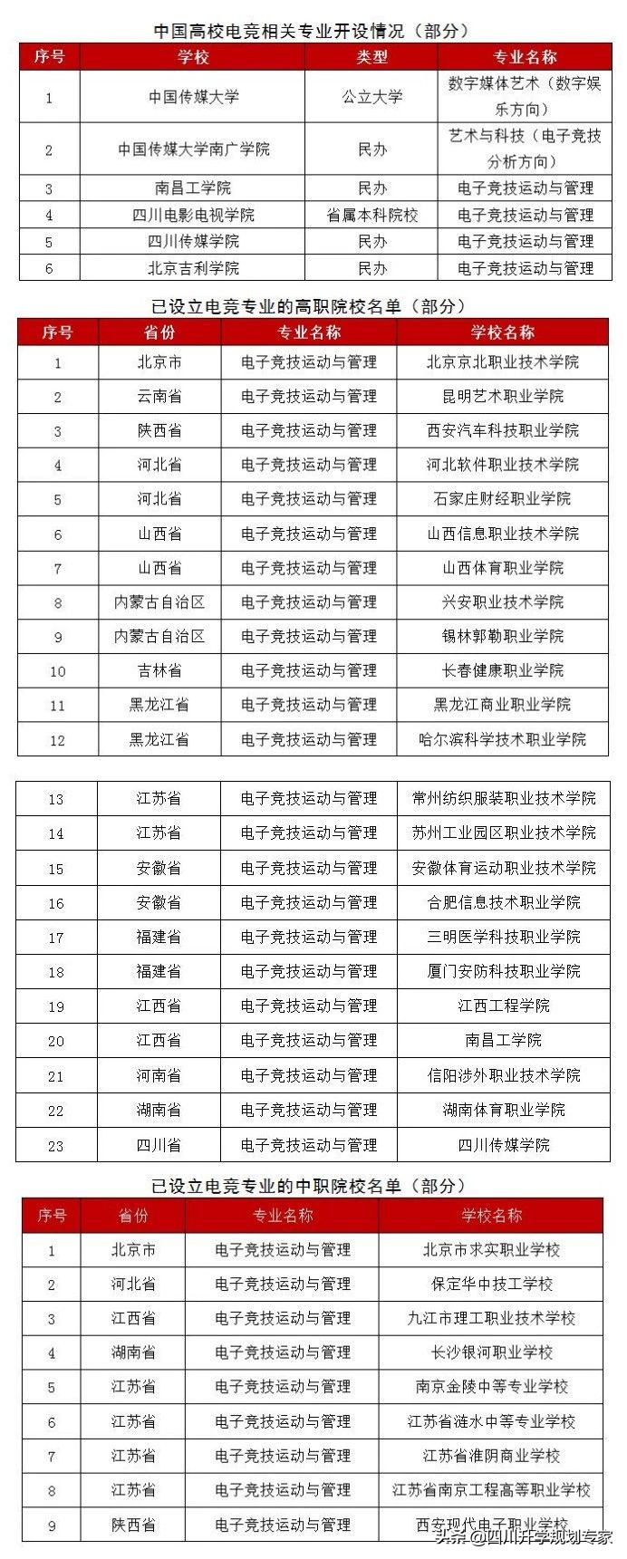 根据人社部的报告,在高校方面,中国传媒大学开设了数字媒体艺术(数字娱乐方向)专业,中国传媒大学南广学院、南昌工学院、四川电影电视学院、四川传媒学院、北京吉利学院等也开设了电竞相关专业。