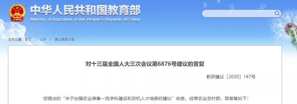 近日,教育部在“对十三届全国人大三次会议第6876号建议的答复”中提到:新一轮“双一流”建设将继续坚持扶强扶优,聚焦高端农业装备的重大需求和急迫生产实践问题,加大对农业学科、农业工程等相关领域的支持力度,调整优化建设高校布局和学科结构。
