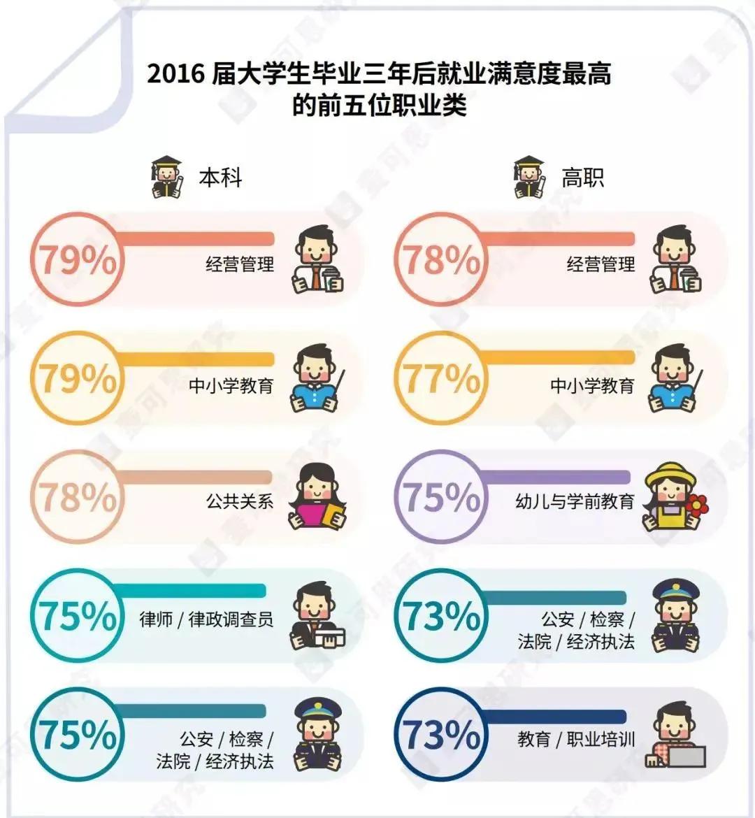 在具体职业类中,本科和高职的毕业生,三年后就业满意度最高的均是经营管理,其次是中小学教育。