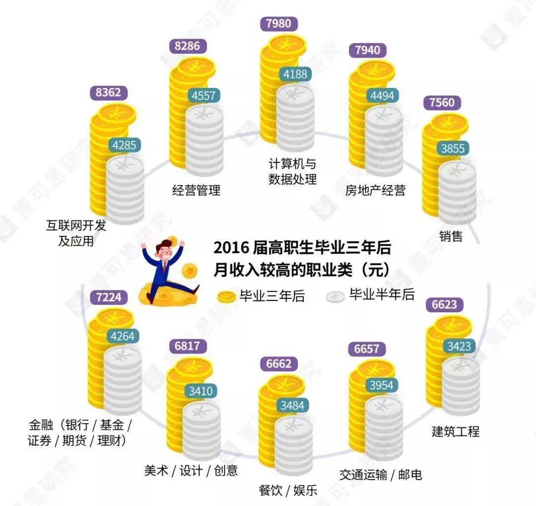 高职生毕业三年后,薪资较高的是互联网开发及应用和经营管理,涨幅翻倍的是美术/设计/创意类职业。