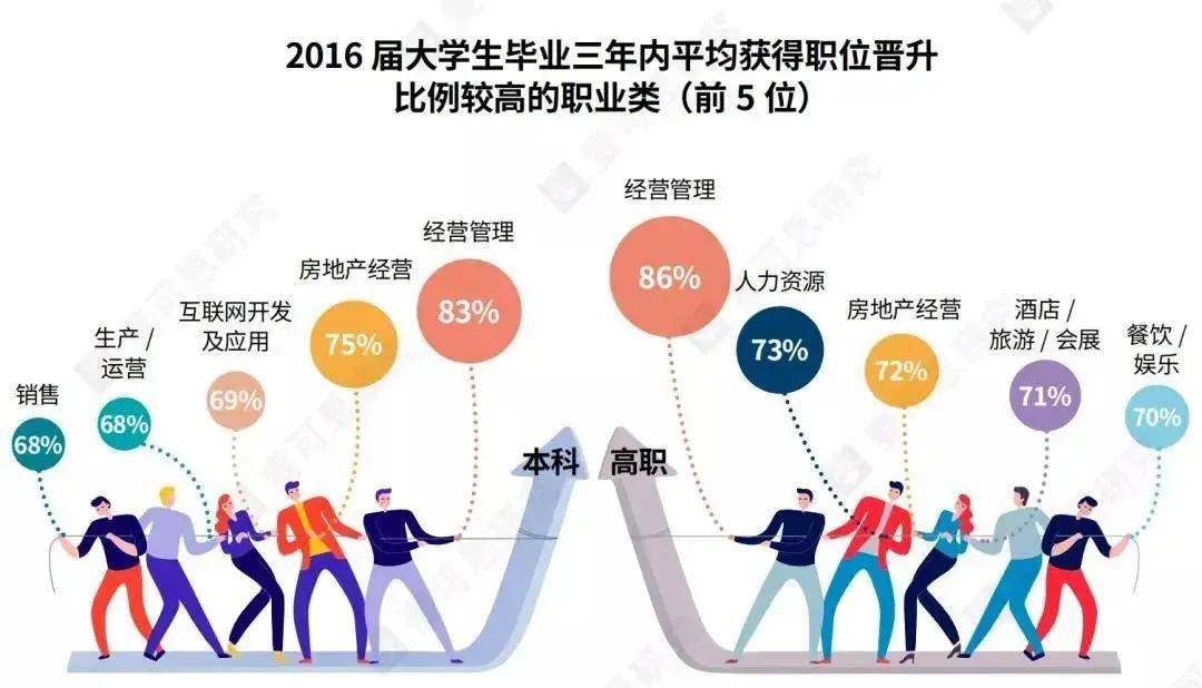 研究发现,2016届本科生中,56%的人在毕业三年内有过职位晋升,高职生的该比例为61%。