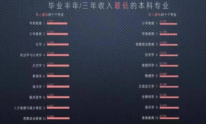 很明显,不管是毕业半年或者三年后,最低的本科专业基本全是教育类专业,包含小学教育、学前教育、思想政治教育、历史学等专业。