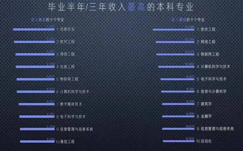 另外根据相关数据统计,毕业半年和三年后收入最高的十大本科专业排行中,可以看出,收入最高的专业基本都是互联网和计算机的相关专业。