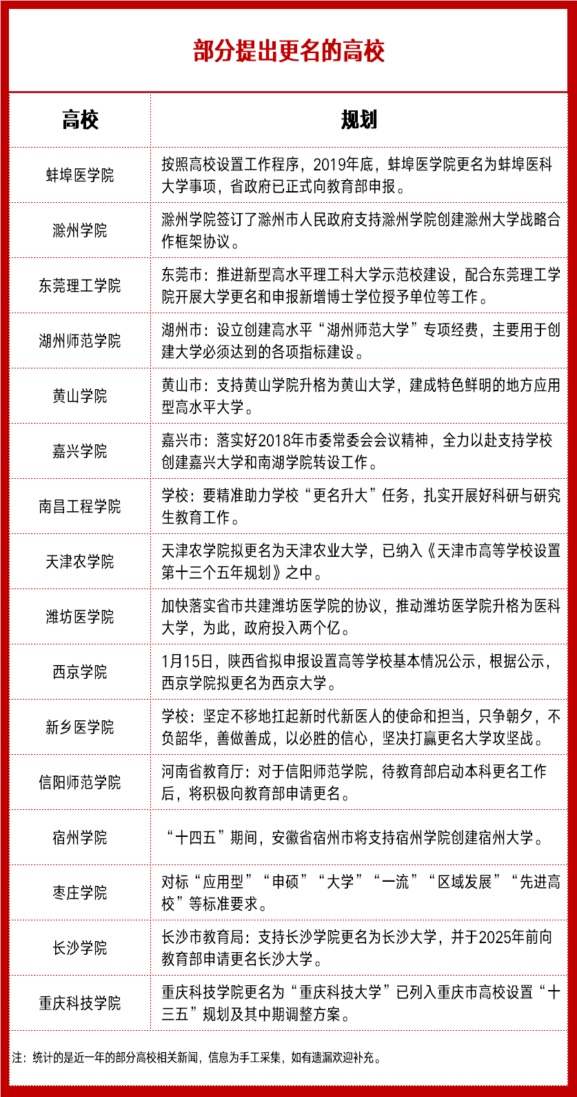 过去的一年里,许多高校在官方场合中表示要更名为大学,一些地方政府在官方文件中表示支持,这些学院下定决心要“升格”为大学。