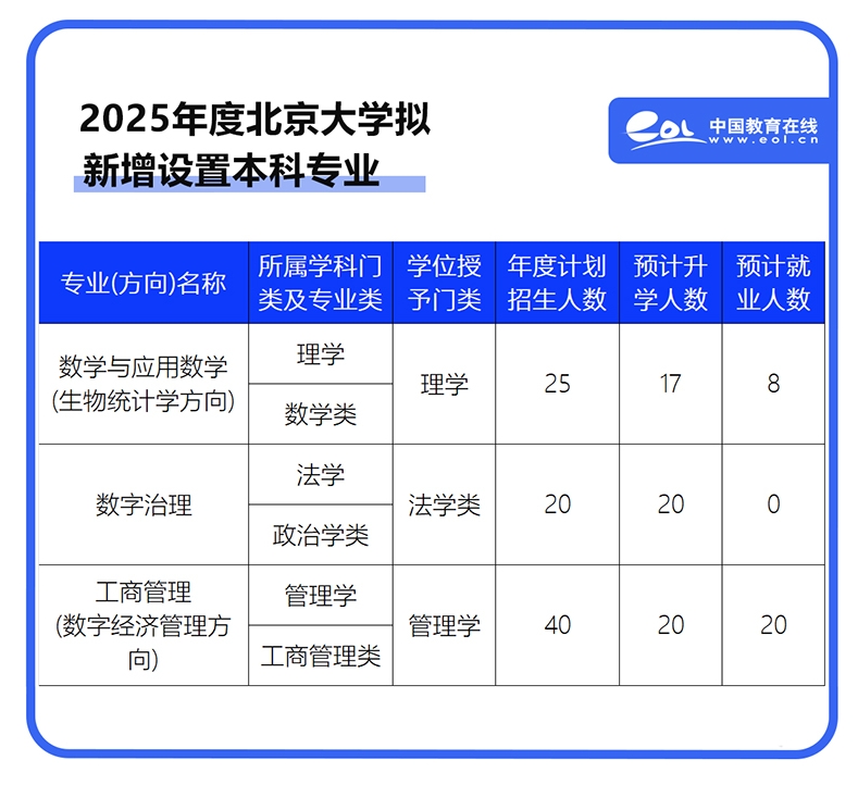 拟新增3个本科专业:按照教育部《普通高等学校本科专业设置管理规定》(2012年)的要求,经数学科学学院等院系申请,新增专业所在学部同意,并经学校教学指导委员会讨论通过,2025年度数学科学学院等院系拟新增设置“数学与应用数学(生物统计学方向)”“数字治理”“工商管理专业(数字经济管理方向)”等3个专业。