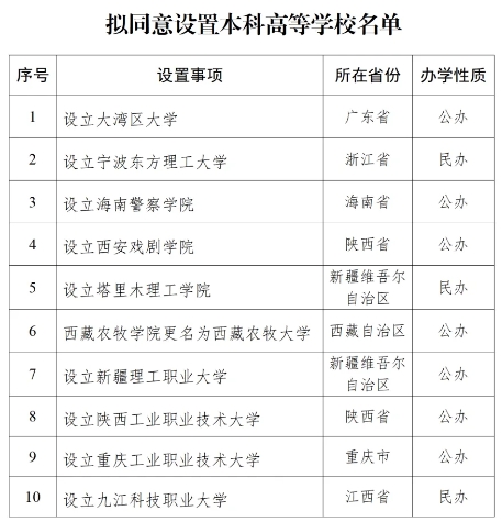 6月11日,教育部发布《关于拟同意设置本科高等学校的公示》,拟同意设置大湾区大学、宁波东方理工大学等10所学校