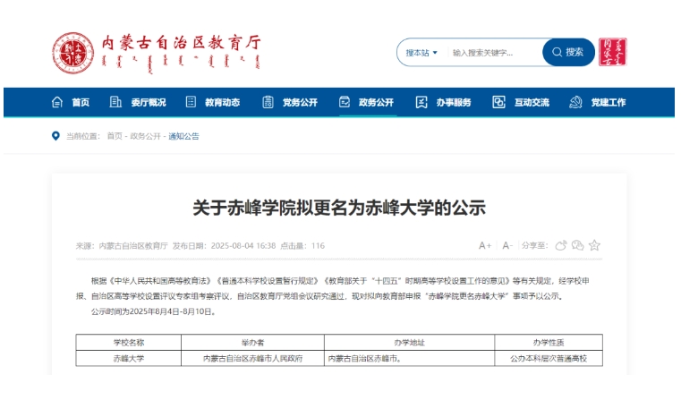 8月4日,内蒙古自治区教育厅发布《关于赤峰学院拟更名为赤峰大学的公示》。根据《中华人民共和国高等教育法》《普通本科学校设置暂行规定》《教育部关于“十四五”时期高等学校设置工作的意见》等有关规定,经学校申报、自治区高等学校设置评议专家组考察评议,自治区教育厅党组会议研究通过,现对拟向教育部申报“赤峰学院更名赤峰大学”事项予以公示。公示时间为2025年8月4日-8月10日。