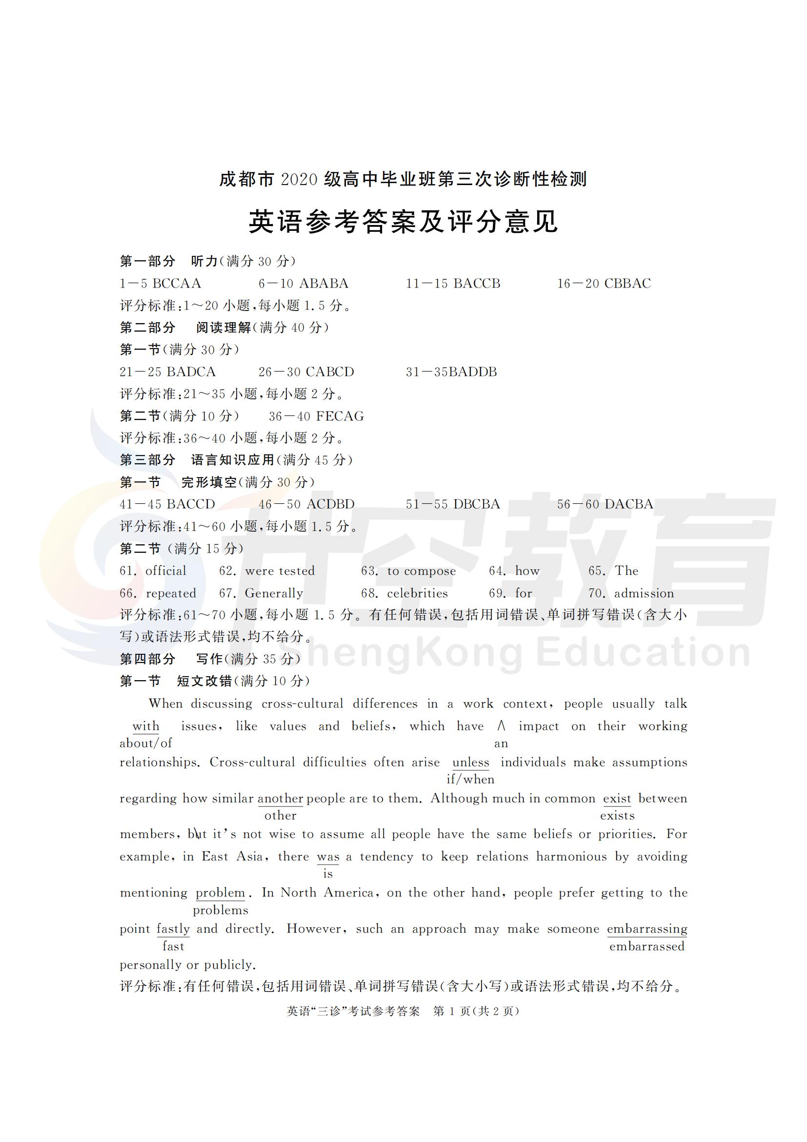 成都三诊英语答案: