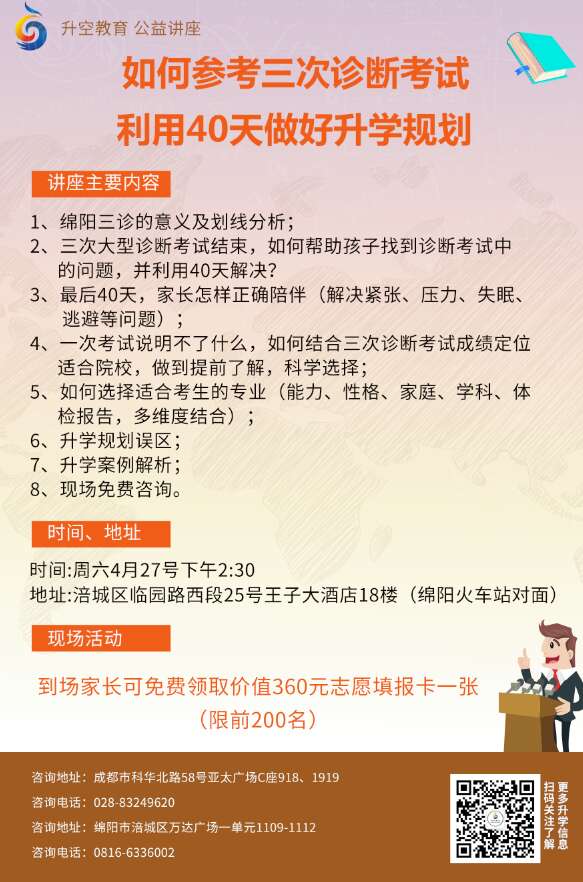 19年4月27日下午2:30,绵阳王子大酒店,升空教育升学规划指导讲座,在绵阳的家长欢迎参加!